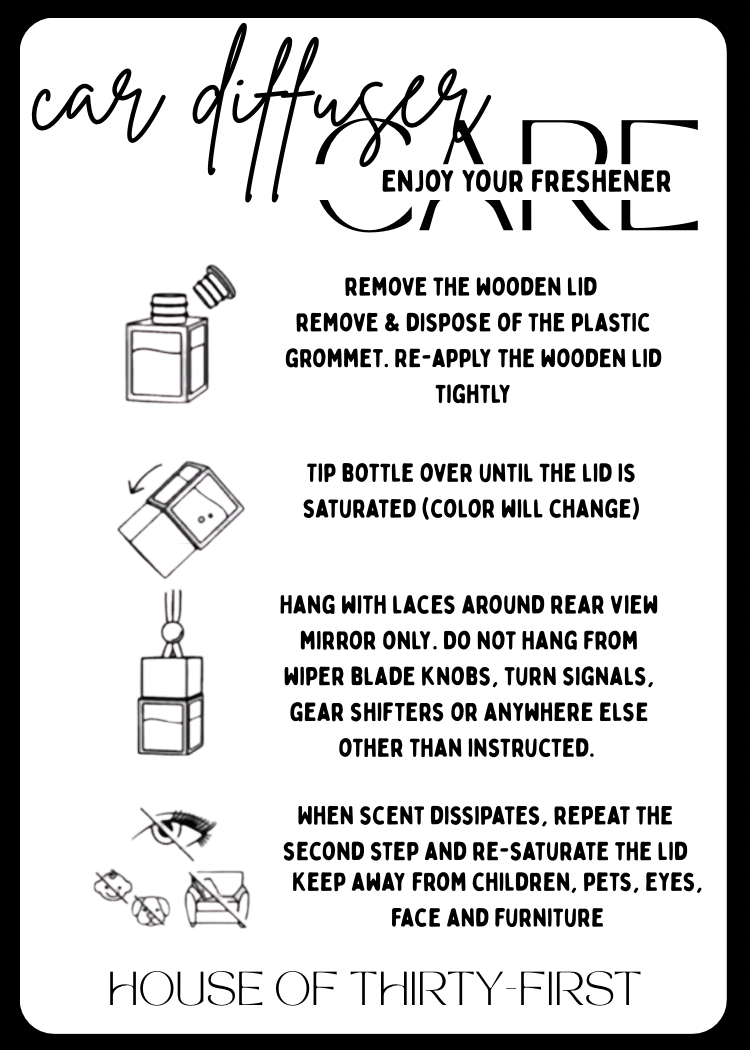 ‣ DO NOT hang from anywhere else other than your car mirror. As the strings become saturated with the diffuser fragrance, you do not want them rubbing against the plastics/vinyl of you car as they can potentially cause damage when left on the interior.